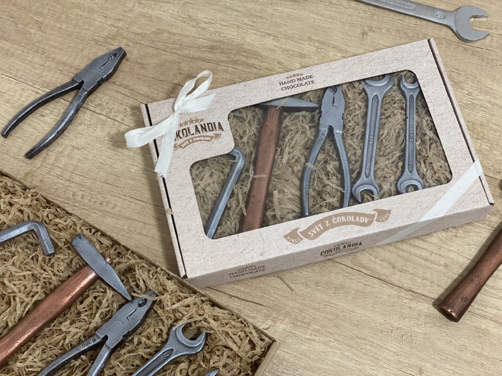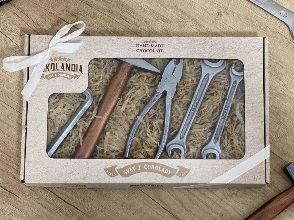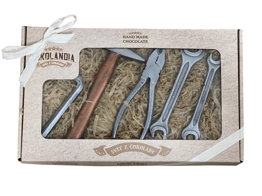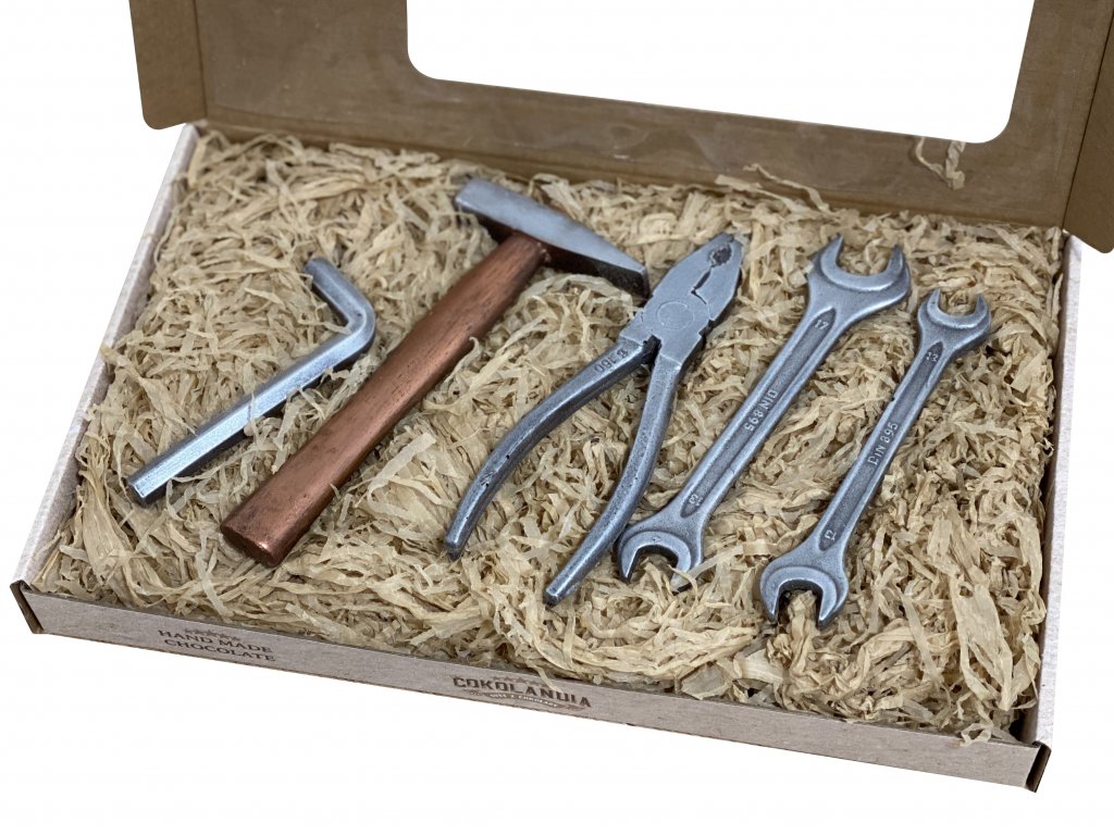 Originelles Werkzeugset mit Hammer aus hervorragender Schokolade mit mindestens 58% Kakaoanteil.